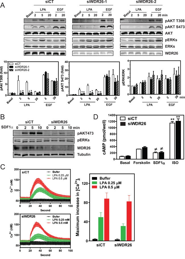 Figure 5: WDR26 selectively regulates Gβγ-mediated AKT phosphorylation. MDA-MB231 cells were transiently transfected with a control siRNA (siCT) or siRNAs targeting WDR26 (siWDR26), and the effects on Gβγ-AKT phosphorylation and Gα-mediated cAMP accumulation or Ca2+ signaling were determined. A-B. LPA (10 μM)-, EGF (50 ng/ml) (A)- or SDF1α (100 nM)(B)-stimulated AKT and ERK phosphorylation determined by Western blotting. Data in A are expressed as the fold-increase over the unstimulated control (basal) after the levels of phosphorylated proteins are normalized to that of total proteins. *, ** p<0.05, versus siCT (n=5). C-D. LPA-stimulated Ca2+ signaling (C), SDF1α-mediated decrease in cAMP accumulation and isoproterenol (ISO)-stimulated increase in cAMP (D). Ca2+ signaling was measured using Fura-2/AM. Representative data and maximum Ca2+ concentration (n=3) are shown in C. To measure SDF1α- and ISO-induced decrease and incrase in cAMP accumulation, respectively, cells were treated with either forskolin (10 μM) alone or forskolin (10 μM) plus SDF1α (50 nM) or ISO (1 μM) (n=3).
