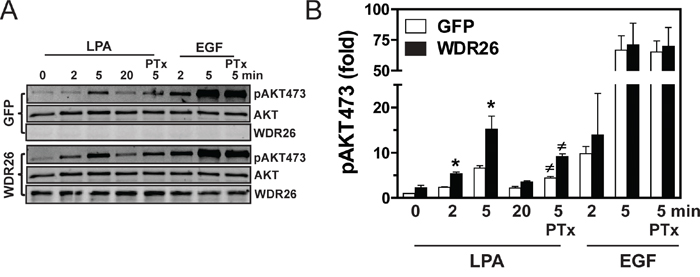 Figure 6: Overexpression of WDR26 in MCF7 cells enhances PI3K/AKT activation. A. representative blots show AKT phosphorylation in MCF7 cells expressing inducible GFP or WDR26. To determine the effect of PTx, cells were pre-treated with PTx (200 ng/ml) overnight. B. Quantitative data from three independent experiments. Data are expressed as a fold-increase over GFP basal. * p<0.05 versus GFP basal; # p<0.05 versus PTx-untreated.