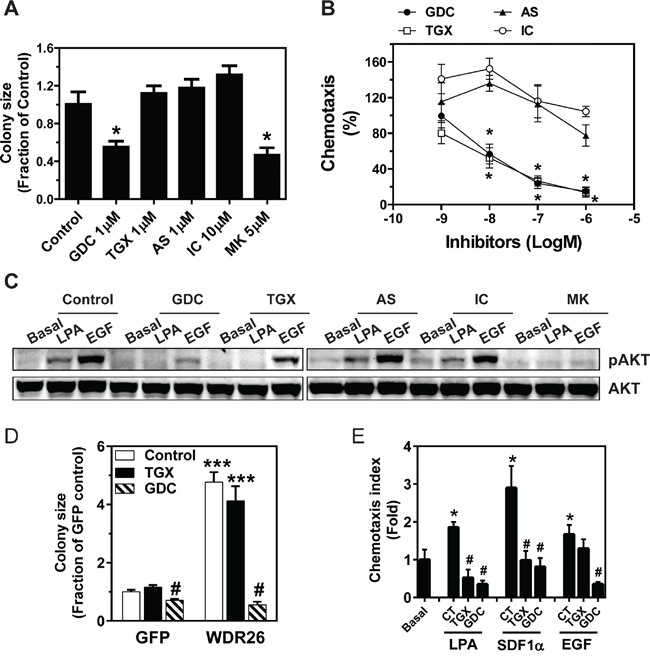 Figure 7: PI3K/AKT activation contributes to WDR26-regulated breast cancer cell growth and migration. A-C. effects of PI3K and AKT inhibitors on MDA-MB231 cell growth and migration. MDA-MB231 cells were treated with the indicated PI3K and AKT inhibitors at the indicated doses, and the effects on tumor cell growth in Matrigel (A), cell migration (B) and LPA- and EGF-simulated AKT phosphorylation (C) were determined. *p<0.05 versus untreated control (n=3). GDC(GDC0941), TGX(TGX221), AS(AS605240), IC(IC87114) and MK(MK2206) are inhibitors for pan-PI3K, PI3Kβ, PI3Kγ, PI3Kδ and pan-AKT, respectively. D-E. effects of PI3K inhibitors on the growth (D) and migration (E) of MCF7 cells overexpresssing GFP or WDR26. TGX, TGX221 1μM; GDC, GDC0941 1 μM; CT, control. *** p<0.001 versus GFP control; #p<0.01 versus GFP or WDR26 control (n=3) in D. * p<0.05 versus basal; # p<0.01 versus CT (n=4) in E.