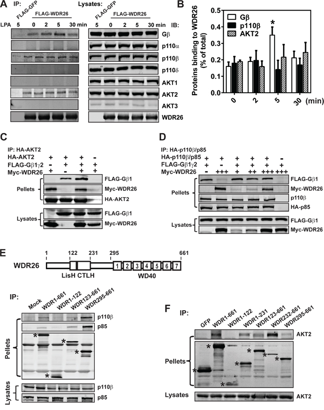 Figure 8: WDR26 fosters the interactions between Gβγ, PI3Kβ and AKT2. A-B. WDR26 is selectively co-immunoprecipitated with endogenous Gβγ, PI3Kβ and AKT2 in MDA-MB231 cells. MDA-MB231 cells expressing FLAG-GFP or FLAG-WDR26 were stimulated with LPA (10 μM) for the indicated time and subjected to immunoprecipitation with an anti-FLAG antibody. Co-immunoprecipitated proteins were detected with the indicated antibodies. Representative blots are shown in A and quantitative data from three independent experiments are shown in (B) The amount of immunoprecipitated proteins is expressed as the percentage of total proteins in the lysates, with the background binding from FLAG-GFP immunoprecipitates substracted. * p<0.05 versus 0 min (n=3). C. WDR26 binds AKT2 and enhances its interaction with Gβγ. HEK293 cells were transiently transfected with HA-AKT2 and FLAG-Gβ1γ2 or Myc-WDR26, or FLAG-Gβ1γ2 plus Myc-WDR26. Cell lysates were immunoprecipitated with an anti-HA antibody. D. WDR26 binds PI3Kβ and forms a trimeric complex with PI3Kβ and Gβ1γ2. MDA-MB231 cells transduced with adenoviruses encoding the indicated proteins were subjected to co-immunoprecipitation assays as described in (C) E-F. the binding sites of PI3Kβ and AKT2 on WDR26. FLAG-GFP, FLAG-WDR26 and its deletion mutants were transiently co-expressed with PI3Kβ in MDA-MB231 (E) or AKT2 in HEK293 (F) cells, and were immunoprecipitated from cell lysates with an anti-FLAG antibody. The bands corresponding to GFP, WDR26, and its mutants are indicated by asterisks. A schematic representation of the WDR26 structure is shown in the top panel of E. Experiments in (C-F) were repeated for at least three times with similar results.