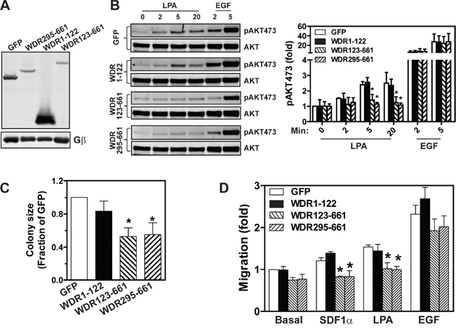 Previously, we showed that the WDR123-661 deletion mutant can bind both Gβγ and its effector, PLCβ2 [24]. However, when it was overexpressed in leukocytes, it acted as a dominant-negative mutant: it inhibited full-length WDR26 from promoting Gβγ-mediated Ca2+ signaling and cell migration [24]. Given that the WDR26 fragments, WDR123-661 and WDR295-661, could still interact with AKT2 and PI3Kβ, we reasoned that they might also interfere with the function of the full-length WDR26 in breast cancer cells. To test this, we generated stable MDA-MB231 cells expressing inducible WDR123-661 and WDR295-661, with GFP and WDR1-122 as controls. As compared to GFP, induced expression of WDR1-122 had no effect on LPA- or EGF-stimulated AKT phosphorylation (Figure 9A-9B). In contrast, inducing expression of WDR123-661 and WDR295-661 in MDA-MB231 cells decreased LPA-stimulated AKT phosphorylation by 50% (Figure 9A-9B). Consistent with their effect on AKT activation, induced expression of WDR123-661 and WDR295-661, but not WDR1-122, significantly reduced the size of MDA-MB231 cell colonies in Matrigel (Figure 9C), and LPA- or SDF1α-induced cell migration (Figure 9D). The effect of these mutants is likely to be specific since WDR123-661 and WDR295-661 neither affected EGF-stimulated AKT activation nor cell migration (Figure 9B and 9D).