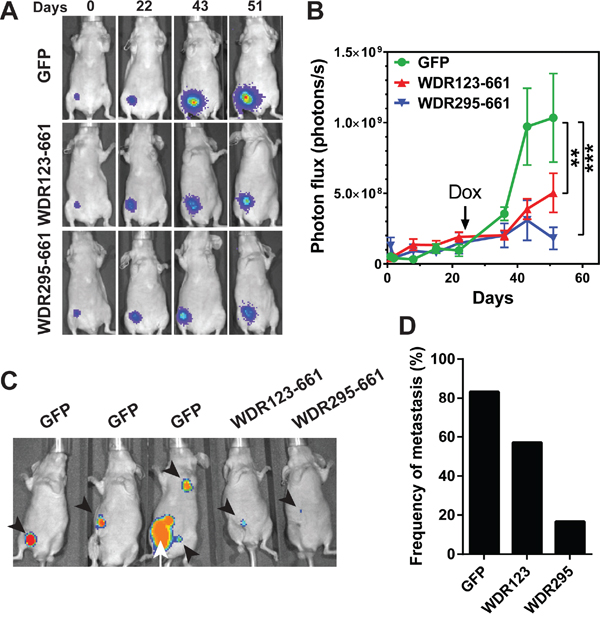 All animal studies were conducted in accordance with an IACUC-approved protocol (4091161) at the University of Iowa. Female nude BALB/c mice, aged 8 to 10 weeks, were used for the study. 1 ×106 of MDA-MB-231 cells expressing inducible EGFP, WDR123-661 and WDR295-661 in 100μl saline were implanted into the right inguinal mammary fat pads of mice that were randomly chosen. They were allowed to grow for 23 days to form palpable primary tumors before the mice were treated with doxycycline (2mg/ml in drinking water) to induce protein expression. Primary tumor growth was monitored by bioluminescence imaging (BLI) and caliper measurement, weekly, by an investigator blinded to the experimental groups [19]. Once the primary tumor volume reached ~500 mm3, they were resected and the mice were monitored for another four weeks, for the formation of metastases by BLI. The metastases were confirmed by post-mortem ex-vivo BLI.