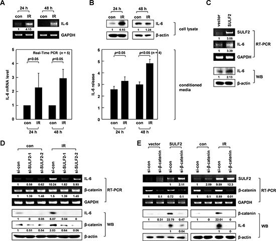 Figure 3: SULF2 mediates IR-induced IL-6 expression via β-catenin. A. The irradiated and untreated control cells were analyzed for IL-6 mRNA expression by RT-PCR (top) or real-time PCR (bottom). B. Cell lysates and conditioned media from the irradiated and untreated control cells were prepared. IL-6 protein levels were analyzed by western blotting (cell lysates) and ELISA (conditioned media). C. Control and SULF2 A549 transfectants were analyzed for their levels of SULF2 and IL-6 expression by RT-PCR and western blotting. D. Cells treated with control or SULF2 siRNAs were irradiated and analyzed for IL-6 and β-catenin expression by RT-PCR and western blotting. E. Cells were transfected with SULF2 expression vectors and β-catenin siRNAs using the indicated combinations (left panels). Alternatively, cells were treated with control or β-catenin siRNA and irradiated (right panels). In both cases, SULF2, β-catenin, and IL-6 expression levels were analyzed by RT-PCR or western blotting.