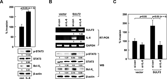Figure 4: IL-6 mediates the ability of SULF2 to stimulate the STAT3-Bcl-XL pathway. A. A549 cells were incubated in the presence or absence of IL-6 (20 ng/mL) for 24 h. Cell invasiveness and the levels of indicated proteins were compared. B. The cells were transfected with the SULF2 expression vector and IL-6 siRNAs using the indicated combinations. Cellular levels of the indicated components were analyzed by RT-PCR or western blotting. C. Invasiveness of the transfectants was compared.