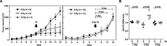 Figure 5: Sublethal doses of IR increase SULF2 mRNA levels in vivo. A. H460 cells were implanted to form xenograft tumors in mice. On the 7th day after implantation, the tumors were locally irradiated with the indicated doses of γ-rays. Tumor diameters were measured, and tumor volumes were calculated on the specified days. B. At 1, 2, or 5 days post-irradiation, the mice were sacrificed and the tumors were removed. SULF2 mRNA levels in the tumors were compared by RT-PCR. The values shown represent the relative levels of SULF2 mRNA normalized to those of GAPDH.