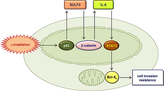 Figure 8: A proposed model for the IR-induced signaling pathway that leads to an increase in cellular invasiveness and resistance. IR induces the expression of SULF2 via p53. SULF2 is externally secreted, where it stimulates the β-catenin pathway, promoting the expression and secretion of IL-6. IL-6 then stimulates the STAT3-Bcl-XL pathway, which leads to an increase in cellular invasiveness and resistance.