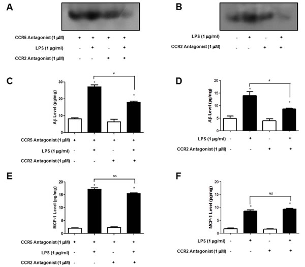 To further demonstrate the involvement of CCR2 in CCR5-mediated amyloidogenesis NF-ĸB activation, Aβ accumulation and MCP-1 level were determined in astrocytes and microglia cells. We used BV-2 cells treated with CCR5 antagonist, D-ala-peptide T-amide (DAPTA) and cultured astrocytes isolated from CCR5-/- mice treated with LPS (1μg/ml) and CCR2 antagonist (Santa Cruz Biotechn, Santa Cruz, CA, USA), and measured the DNA binding activity of NF-ĸB by EMSA. Aβ accumulation was also determined by Aβ specific ELISA kit. The treatment of CCR2 antagonist, decreased the DNA binding activity of NF-ĸB in DAPTA treated BV-2 cells (Figure 6A) and cultured astrocytes isolated from CCR5-/- mice (Figure 6B). Aβ levels were also decreased after CCR2 antagonist treatment in DAPTA treated BV-2 cells (Figure 6C) and cultured astrocytes isolated from CCR5-/- mice (Figure 6D). Additionally, the level of MCP-1 protein was also determined by specific ELISA kit. However, MCP-1 levels were not changed by treatment of CCR2 antagonist in DAPTA treated BV-2 cells (Figure 6E) and cultured astrocytes isolated from CCR5-/- mice (Figure 6F). These data show that treatment of CCR2 antagonist could decrease NF-ĸB activity and amyloidogenesis through blocking to bind CCR2 and its ligand MCP-1.