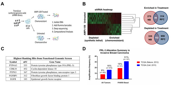 Figure 4: Functional genetic screen with AMPI-109 identifies PRL-3 amplification in invasive basal breast cancers. A. Schematic representation of the experimental work flow of the functional genomic screen. BT-20 cells were transduced with a genome-wide shRNA library and treated with AMPI-109 (750 nM) or left untreated. After 5 passages the shRNA tag sequences were recovered and quantified by deep sequencing. Data were analyzed by complementary computational analyses generating lists of mediators of chemoresistance and chemosensitivity to AMPI-109. B. Heatmap of shRNA tag representation in AMPI-109-treated and untreated samples. Right panel: Two analysis strategies (NB, negative binomial and RFC, relative fold change) implicated 2,084 genes that modulate the effects of AMPI-109. 201 genes were identified by combined analysis strategies. C. Table highlighting highest ranking gene hits enriched by AMPI-109 treatment by normalized fold change (nFC). D. Bar graph depicting level of PRL-3 amplification in TCGA Nature, 2012 cohort (red) and TCGA Cell, 2015 dataset (blue) for patients with invasive breast cancer (all tumors) and those with invasive basal breast cancer as determined by the PAM50 signature (PAM50 Basal).