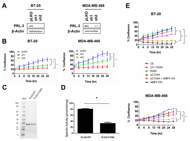 Figure 5: PRL-3 knock down and expression of catalytically impaired PRL-3 results in reduced growth of TNBC cells. A. Immunoblot analysis of PRL-3 levels following transduction of BT-20 (left) and MDA-MB-468 (right) cells with lentiviral vectors expressing PRL-3 shRNAs (sh1 and sh2). pLKO is non-silencing control shRNA. B. Real time kinetic monitoring of cellular proliferation of BT-20 (left) and MDA-MB-468 (right) TNBC cells with non-silencing control shRNA (pLKO; blue) and PRL-3 shRNAs (sh1; red, sh2: green). C. SDS-PAGE analysis of FLAG-tagged recombinant wild type PRL-3 (FLAG-WT) and PRL-3 C104A (FLAG-C104A). Numbers indicate molecular weights (MW) in kilodaltons. D. The enzymatic activity of FLAG-tagged recombinant proteins was determined by in vitro phosphatase assay. E. BT-20 (top) and MDA-MB-468 (bottom) cells were transiently transfected with pC104A mammalian expression vector (pC104A; purple) or empty vector (Ctl; blue) 24 hrs prior to plating in IncuCyte. Cells were treated with ethanol vehicle control (EtOH; green) or 100 nM AMPI-109 (AMPI-109; black). Transfection control cells treated with ethanol vehicle (Ctl + EtOH; red) and pC104A cells treated with AMPI-109 (pC104A + AMPI-109; orange) are also depicted. Cellular proliferation measured by real time kinetic monitoring of plate confluence. * = p-value < 0.05 as determined by Student t test on last time-point.