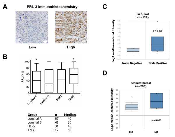 Figure 7: PRL-3 expression is increased in TNBC. A. Examples of PRL-3 staining scored as low or high, 20 µm scale bars. B. Whisker plot and table of PRL-3 expression across different breast cancer subtypes. * = p-value ( < 0.008) based on post hoc Dunn’s test from Kruskal-Wallis non-parametric ANOVA. (C and D) Differential PRL-3 mRNA expression in two human breast cancer datasets examining correlation to regional disease and visceral metastases.