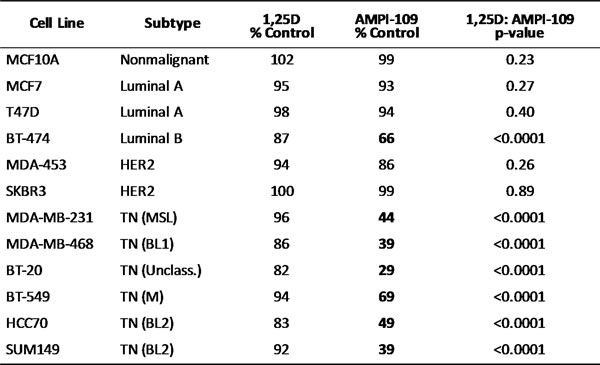 We examined the ability of AMPI-109 to inhibit the proliferation of breast cancer cells of various molecular subtypes including TNBC. A cohort of 12 breast cancer cell lines was treated with AMPI-109 at its approximate IC50 value of 100 nM (determined by cellular proliferation assays in response to escalating doses of AMPI-109) or vehicle control. Of the 7 cell lines that showed significant response to AMPI-109, 6 were TNBC cell lines representing 5 different molecular subtypes of TNBC (Table 1 and Figure 2A). In these experiments we also compared AMPI-109 to its parent compound, 1,25D. AMPI-109 was far superior to 1,25D in inhibiting the growth of all cell lines tested (Table 1). Importantly, AMPI-109 had no effect on proliferation of non-tumorigenic breast cells (MCF10A) or the majority of non-TNBC cell lines (Table 1 and Figure 2A).