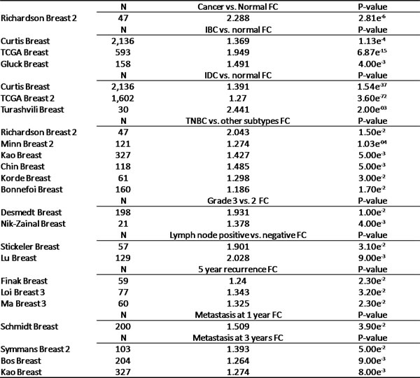 Left column, Oncomine dataset examined. N = Sample size in analysis. IBC = Invasive Breast Cancer. IDC = Invasive Ductal Carcinoma. TNBC = Triple-Negative Breast Cancer. FC = Fold Change in PRL-3 expression. P values computed by Pearson r test.