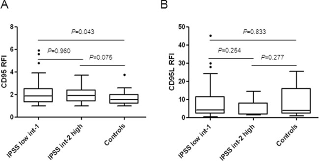 We also quantified the expression of membrane-bound CD95L on CD45low bone marrow cells in 82 MDS before treatment and 18 controls (Supplementary Table S1). We found that the median RFI of CD95L was similar between IPSS low/int-1 MDS, int-2/high MDS and controls groups (Figure 1B) and similar between the IPSS-R very low/low/intermediate, very high/high and controls groups (Supplementary Figure S1B).