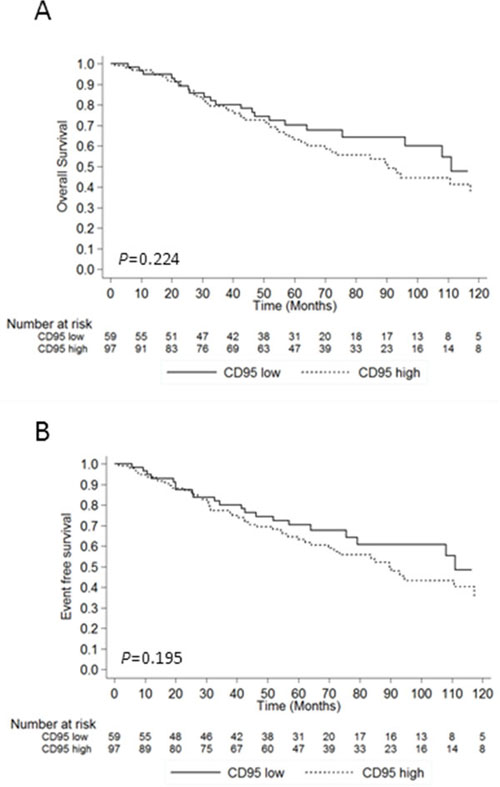 In the whole cohort, follow-up information was available for 204/250 (81.6%) and the median follow-up was 57.2 (IQR: 25.6 – 87.3) months. Clinical follow-up data were available for 156/162 (96.3%) low/int-1 MDS patients including 97 (62.2%) with high CD95 expression and 59 (37.8%) with low CD95 expression. The median follow-up in the low/int-1 cohort was 60.0 (IQR: 32.5 – 90.7) months. As shown in Table 1, treatments including RBC transfusions, ESA, lenalidomide, azacitidine, low dose aracytine, intensive chemotherapy and allo-HSCT were equivalent in CD95low and CD95high patients. No difference of overall survival (P = 0.224) or event-free survival (P = 0.195) was found between the two groups (Figure 2A & 2B). Finally, none of the studied genotypes at -1377 or -670 loci had any impact on overall survival or event-free survival (Supplementary Figure S2).
