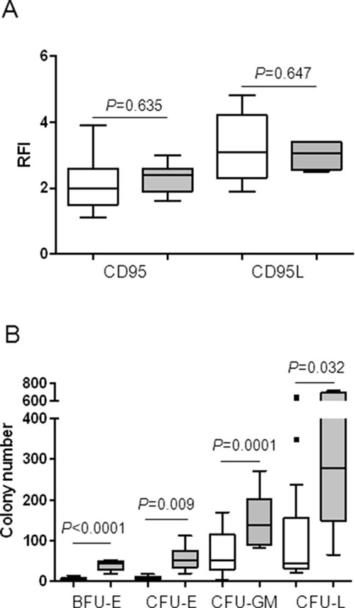 Figure 5: Low progenitor cell number, but not CD95 or CD95L expression at baseline is predictive of the response to APG101. A. CD95 and CD95L were quantified by flow cytometry and expressed as RFI. B. Bone marrow mononuclear cells were seeded at 105 cells/mL in methylcellulose. BFU-E and CFU-GM were counted after 14 days and CFU-E and CFU-L were counted after 7 days. Results are expressed as colony numbers. White boxes for responders and gray boxes for non-responders. Horizontal bars represent medians and 1st and 99th centiles. Student t-test for P values.