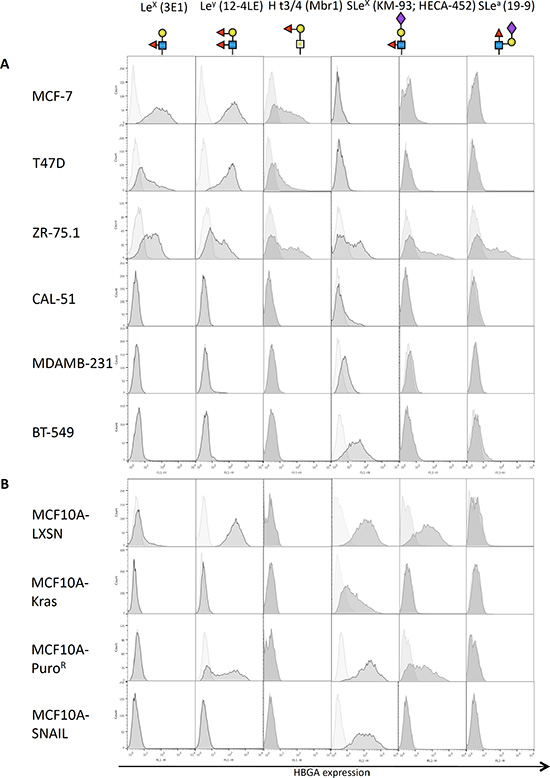 Figure 1: Expression of fucosylated antigens by mammary cell lines. Breast cell lines from tumor origin (A) or derived from the immortalized MCF10A cell line (B) were subjected to flow cytometry using various antibodies directed against fucosylated histo-blood groups antigens, followed by an anti-mouse-FITC secondary antibody. The horizontal axis represents mean fluorescence intensity (MFI) while cell count is indicated on the vertical axis. Structures of the glycan epitopes recognized by each antibody are shown below the antibody description.