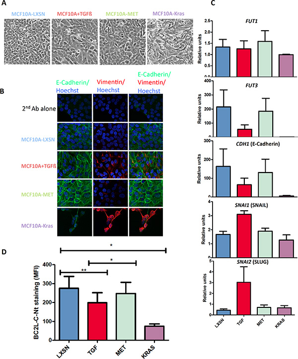 Figure 3: BC2L-C-Nt staining decreases following EMT induction in parallel with fucosyltransferase expression. MCF10A-LXSN cells were passaged in the presence of 10 ng/ml TGF-ß1 e-Bioscience to induce EMT (MCF10A+TGF-ß). The cells were then grown a further 4 days in the absence of TGF-ß to induce a MET (MCF10A-MET). (A) Morphological appearance of the cells. (B) MCF10A-LXSN epithelial cells were treated with either 0,5 μM A83-01 (MCF10A-LXSN) or 5 ng/ml TGF-ß1 R & D (MCF10A+TGF) during four days. TGF-ß was then withdrawn and cells were grown four more days in presence of 0,5 μM A83-01 (MCF10A-MET). Cells were analyzed by immunofluorescence using anti-E-cadherin and anti-Vimentin antibodies followed respectively by a Dylight 488-conjugated and a Rhodamine-conjugated secondary antibody. Nuclei were stained with Hoechst. Pictures were taken with a Nikon confocal microscope at a x60 magnification (C) Total RNAs were extracted from the different cell lines and cDNAs were synthesized using oligo-dT and subjected to qPCR analysis with FUT1, FUT3 and GAPDH specific primers and probes. FUT1 and FUT3 expression levels are presented relative to GAPDH expression. The PCR on CDH1, SNAI1 and SNAI2 was performed using specific primers and SYBrGreen and results are presented relatively to ß-actin expression. Data shown are the mean and SEM of three independent experiments. (D) Binding of BC2L-C-Nt to cells analyzed by flow cytometry. The results are the means and SEM of the MFI of BC2L-C-Nt staining for four independent experiments including the three used in Figure 3C. Statistical significance has been assessed with 2-tailed paired t-tests between the indicated data sets.