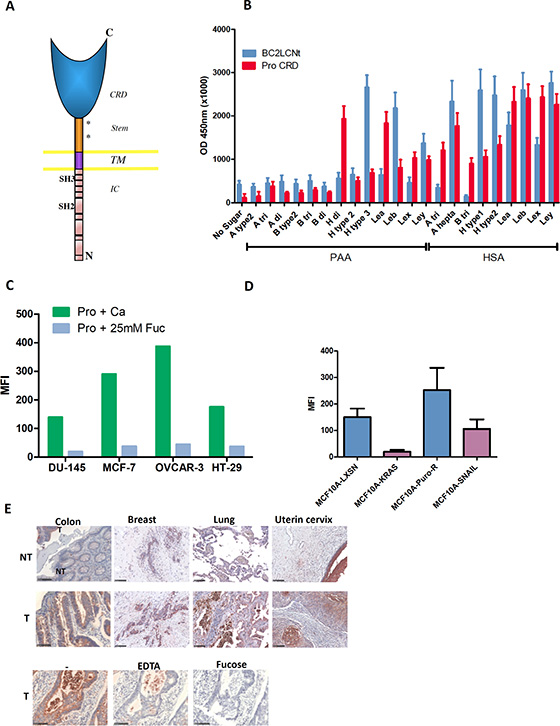 Figure 4: Prolectin is a human C-type lectin that recognizes similar fucosylated ligands as BC2L-C-Nt and efficiently binds to tumor cell lines and tumor tissues. (A) Diagram of Prolectin structure (CRD: carbohydrate recognition domain; TM: transmembrane domain; IC: intra-cytoplasmic domain). (B) Glycan binding assay of prolectin and BC2L-C-Nt. Plates coated with a series of fucosylated HBGAs conjugated to HSA or PAA were probed with either biotinylated-BC2L-C-Nt followed by Avidin-HRP or tetramers of biotin-prolectin CRD bound to streptavidin-HRP. The results shown are the mean and SEM of three independent experiments. (C) Flow cytometry staining of tumor cell lines from various origins. Tetramers of biotinylated-prolectin CRD in complex with streptavidin-PE, pre-incubated in the absence of sugar or with L-fucose, were bound to the indicated cell lines, which were then analyzed by flow cytometry. The bar histogram shows the mean fluorescence intensities. Results are representative of at least two experiments. (D) Prolectin preferentially stains epithelial cell lines. The epithelial/mesenchymal cell lines pairs MCF10A-LXSN/MCF10A-Kras(v12) and MCF10A-PuroR/MCF10A-SNAIL were stained with prolectin as described above. Means and SEM of three independent experiments are shown (E) Prolectin binding to tumor tissues. Tetramers of biotinylated-prolectin CRD conjugated with streptavidin-HRP were incubated on fixed tissue sections from different tumor (T) or adjacent normal (NT) tissues. To control for the involvement of specific glycan binding in the prolectin staining, colon tumor sections were stained as above after prolectin tetramers were incubated with Ca2+, EDTA or Ca2++ L-fucose. Colon tissues had been fixed in ethanol whereas breast, lung and uterine tissues were from formalin-fixed TMAs. Magnifications of 20× are shown (the black bars represent 100 μm).