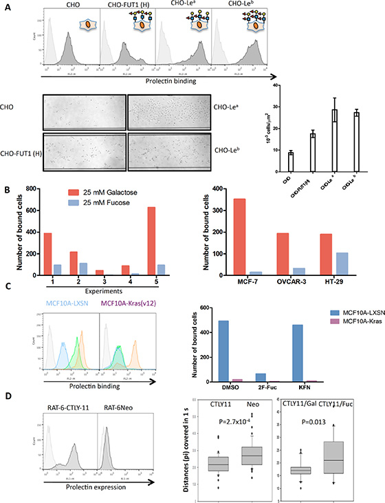 Figure 5: Prolectin acts as a cell adhesion molecule. (A) Expression of fucosylated markers on normal CHO cells or CHO cells engineered to express fucosylated antigens tested by flow cytometry. Cells were introduced in the channels of a BioFlux microfluidic system coated with prolectin/streptavidin tetramers under a pressure of 0.1 Dyn/cm2. Unbound cells were washed away and pictures of the attached cells were taken at 10x magnification with a Leica DMI 6000B microscope. Bound cells were counted on three different segments along the channels and the mean cell densities and SEM are represented on the histogram. (B) DU-145 cells were introduced in the channels under a pressure of 0.1 Dyn/cm2 and in presence or 25 mM D-galactose or L-fucose. Unbound cells were washed away and pictures of the attached cells were taken. Bound cells were counted in the whole channels. The results of five independent experiments are shown. Due to the high variation between experiments, the results are shown separately. Similar experiments were performed with the other tumor cell lines MCF-7, OVCAR-3 and HT-29. (C) MCF10A-LXSN and MCF10A-Kras(v12) cells were treated with dimethyl sulfoxide (DMSO, green), 5 μM kifunensin (orange), or 400 μM 2F-fucose (blue) during four days and stained with prolectin by flow cytometry as described above. Control cells and cells treated with the inhibitors were injected into prolectin-coated BioFlux channels. Unbound cells were washed away and pictures of the attached cells were taken. Bound cells were counted in the whole channels. (D) Prolectin expression was tested on Rat6-Neo and Rat6-CTLY11 fibroblasts by flow cytometry. Percentages of “positive” cells are indicated. Rat6-Neo and Rat6-CTLY11 or Rat6-CTLY11 in the presence of 25 mM galactose or fucose were injected in BioFlux channels covered with a layer of DU-145 cells under a pressure of 0.05 Dyn/cm2. Films of 1 minute (600 pictures) were acquired on a Leica DMI 6000B microscope using the Metamorph software. Chronophotographic images, corresponding to 10 pictures segments of the films, were constructed using the FiJi software and distances covered by individual cells were measured. Student tests were performed to assess statistical significance.