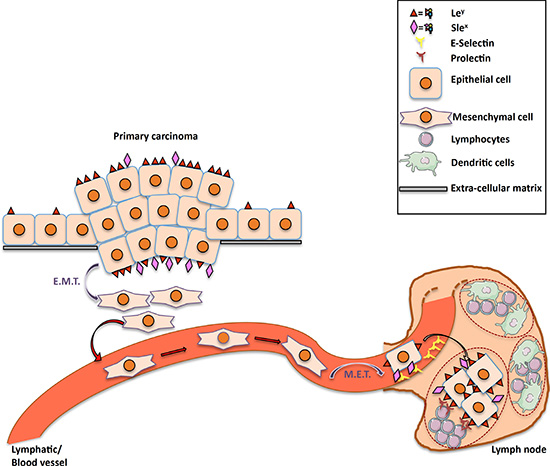 We propose the model illustrated in Figure 7. In a carcinoma overexpressing fucosylated motifs such as Ley and SLex, some cells will go through an EMT, allowing them to detach from their original tissue and migrate to blood or lymphatic vessels. During EMT, Ley and SLex disappear from the cell surface. By a process of MET, tumor cells will re-express fucoslylated ligands. The SLex motifs allow cancer cells to interact with the endothelium of the lymph node afferent vessels and to exit from the blood/lymph stream. Upon entrance into the lymph node, neutral fucosylated ligands allow carcinoma cells to interact with germinal center B cells expressing prolectin, which will help them to settle in the lymph node.