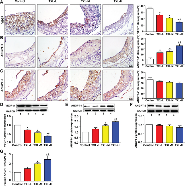 Figure 2: TXL regulates angiogenic factor expression in apoE-/- mice. Representative immunohistochemical images and quantification of A. VEGF-A, B. ANGPT-1, C. ANGPT-2 levels in atherosclerotic plaques of apoE-/- mice. Representative western blot images and quantification of D. VEGF-A, E. ANGPT-1 and F. ANGPT-2 expression in treated mice aortas. G. Quantification of the protein ratio of ANGPT-1/ANGPT-2 in four groups of treated mice. Bar 1: control; bar 2: TXL-L; bar 3: TXL-M; bar 4: TXL-H; Data are mean ±SEM. * P <0.05 vs Control; # P <0.05 vs TXL-L.