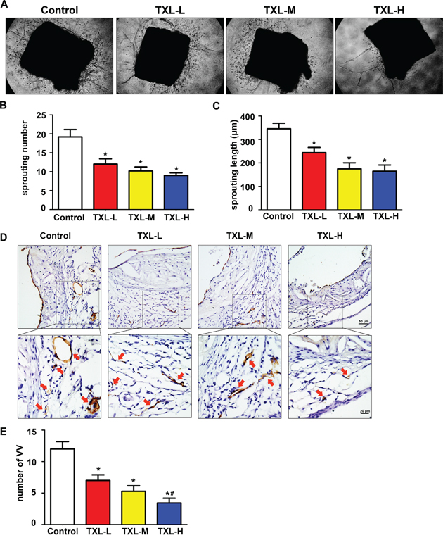 Furthermore, we observed the effect of TXL on plaque-associated angiogenesis ex vivo by mouse aortic ring assay. The numbers and lengths of sprouting microvessel branches from aortic rings were reduced with TXL than control treatment (Figures 3A-3C). Then, we detected VV proliferation in atherogenesis in vivo. Commonly, VV were barely found in arteries of C57 BL/6J mice, but were enhanced in apoE-/- mice feeding high fat diet only for six weeks (Figure 3D, control). Interestingly, treatment with TXL significantly reduced VV numbers in adventitia surrounding the atherosclerotic plaques in aortic roots (Figures 3D, 3E).