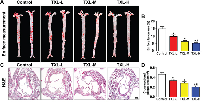 Figure 4: TXL suppresses early atherogenesis in apoE-/- mice. A. Representative images of en face Oil-Red O staining of aortas in four groups of mice. B. Quantitative analysis of en face aorta lesions expressed as percentage lesion area relative to total aorta area. C. Representative images of cross-sectional aortic root lesions by H&E staining. D. Quantitative analysis of cross-sectional plaque area in aortic roots. Data are mean ± SEM. * P <0.05 vs Control; # P <0.05 vs TXL-L.