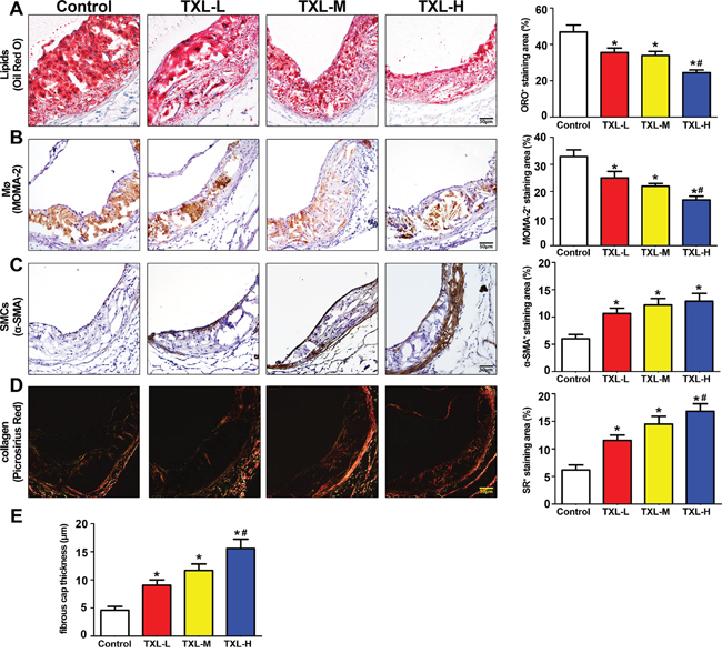 Figure 5: TXL stabilizes atherosclerotic plaque in apoE-/- mice. A. Representative image and quantification of lipid deposition in four treatment groups by Oil-Red O staining. B. Representative immunohistochemical MOMA-2 staining image and quantification of plaque macrophage content. C. Representative immunohistochemical α-SMA staining and quantification of plaque smooth muscle cell content. D. Representative image and quantification of plaque collagen content by Picrosirius Red staining. E. Quantitative analysis of fibrous cap thickness by Picrosirius Red staining. Data are mean ±SEM.* P <0.05 vs Control; # P <0.05 vs TXL-L.