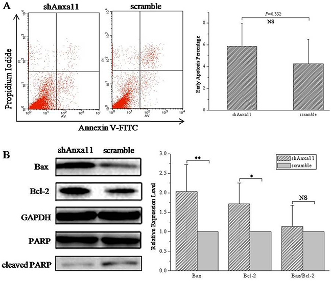 Figure 2: Anxa11 knockdown on Hca-P apoptosis. A. Flow cytometry showed Anxa11 level had no clear effect on Hca-P apoptosis (P>0.05). B. WB assay of the levels of Bax, Bcl-2, PARP and cleaved PARP in shAnxa11-Hca-P and scramble-Hca-P cells. Anxa11 knockdown shows no clear effect on the levels of PARP and cleaved PARP. Bax (**P <0.01) and Bcl-2 (*P<0.05) were up-regulated with statistical significances in shAnxa11-Hca-P compared with scramble-Hca-P cells. Anxa11downregulation exhibited no influence on Bax/Bcl-2 ratio (P>0.05). Three independent measurements were performed for each protein molecule.