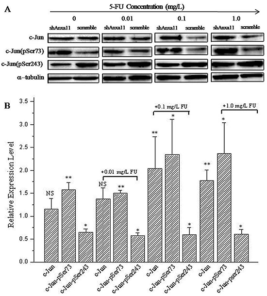 Figure 6: ANXA11 is linked to c-Jun pathway on Hca-P sensitivity to 5-FU. A. WB images of c-Jun, c-Jun (pSer73) and c-Jun (pSer243) in shAnxa11-Hca-P and scramble-Hca-P in 0, 0.01, 0.1 and 1.0 mg/L 5-FU. B. Quantified relative levels of c-Jun, c-Jun (pSer73) and c-Jun (pSer243) in shAnxa11-Hca-P vs scramble-Hca-P cells. Triplicate independent experiemnts were performed for each assay. *and** refer to the differences are in statistical significances with P<0.05 and 0.01, respectively.