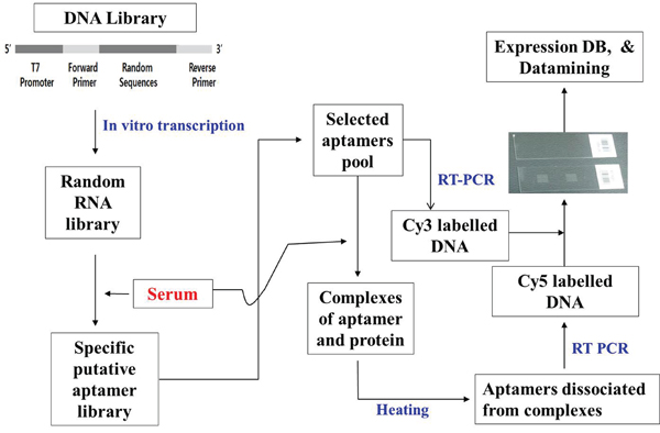 We developed a technique for selection of clinically significant aptamers using complex samples containing unknown molecules. In this method, the base sequences of aptamers bound to serum molecules were determined using serum samples containing unknown molecules, allowing us to create a library. The base sequences that were complementarily bound to the selected aptamers were used to make an oligonucleotide array, and the reaction of clinically significant and well-defined serum samples with the selected serum molecule-binding aptamers was used to profile serum molecule aptamers. A database was created based on clinical information from these profiles. This technique for selection of aptamers that enables discrimination of databases via data mining is called “reverse-SELEX” (unpublished data).