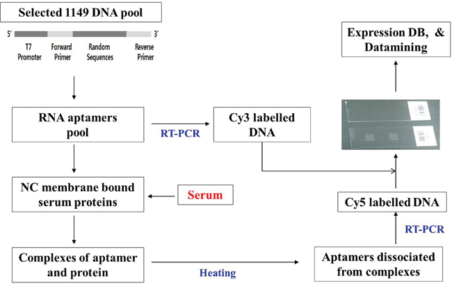 We added 10 μL of serum to 90 μL PB. A nitrocellulose membrane disc was soaked in the mixture for 30 min with shaking. Subsequently, 100 to 400 ng of the serum molecule-binding-aptamers prepared above were added to the mixture and incubated for 30 min to form biomolecules complexes with the serum molecule-binding aptamers. After the serum sample-bound disc was treated with the prepared serum molecule-binding aptamers for 30 min, it was washed three times with a selection buffer or 50 mM ethylenediaminetetraacetic acid to remove unbound serum molecule-binding aptamers. The disc with attached complexes of serum proteins (biomolecules) with serum molecule-binding aptamers were treated RT-PCR buffer, and then RT-PCR was performed using a Cy-5 labeled primer (5-Cy5-CGGAAGCGTGCTGGGCC-3-: SEQ ID NO. 3). The serum molecule-binding aptamers prepared from the plasmid pool were subjected to RT-PCR in the same manner using a Cy-3 labeled primer (5-Cy3-CGGAAGCGTGCTGGGCC-3-). The two resulting solutions were mixed in equal volumes to target single-stranded nucleic acids.