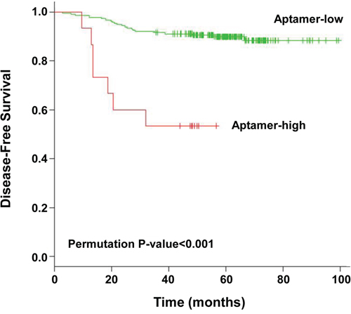 We conducted a multivariate analysis to determine whether classification as low- versus high-risk from the LOOCV was an independent prognostic maker after adjustment for covariates including age, sex, postoperative chemotherapy, serum level of CEA, and clinical risk factors (Table 4). We found that aptamer risk stratification (p < 0.001) was an independent predictor of recurrence.