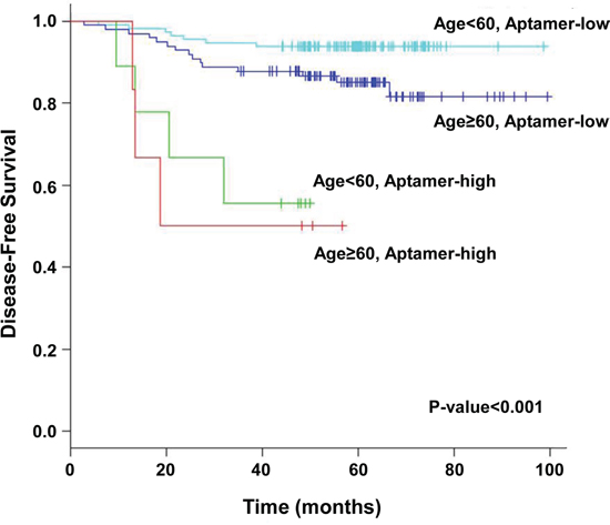 Based on the results of our multivariate analysis, we divided patients into subgroups based on age and the aptamer model (Figure 5). The 5-year disease-free survival rates of patients who were <60 years old and aptamer low-risk (n = 114), <60 years old and aptamer high-risk (n = 9), ≥60 years old and aptamer low-risk (n = 98), and ≥60 years old and aptamer high-risk (n = 6) were 93.9%, 55.6%, 85.1%, and 50.0%, respectively (p < 0.001, Figure 5) We observed that survival curves constructed according to aptamer risk level (predicted through LOOCV) and age were significantly different.