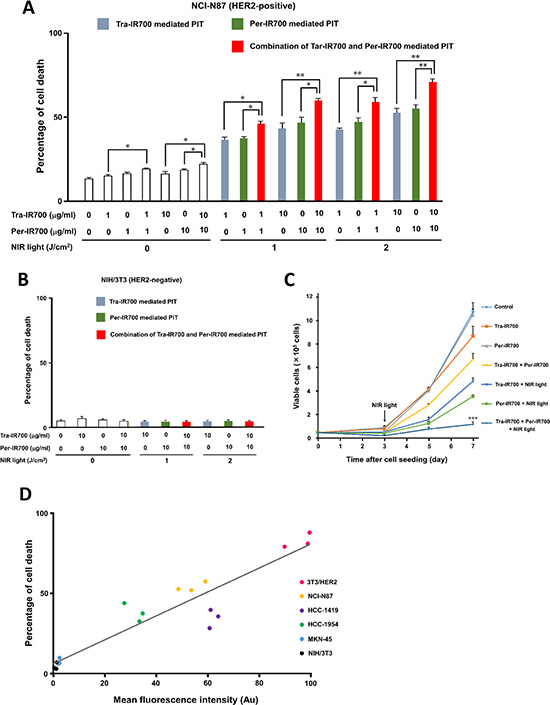 Figure 2: Trastuzumab-IR700- and pertuzumab-IR700-mediated photoimmunotherapy leads to enhanced phototoxic effect compared to photoimmunotherapy using either agent in vitro. (A) LIVE/DEAD assay in NCI-N87 cells showed that the percentage of cell death increased significantly with combination treatment with Tra-IR700 and Per-IR700 followed by NIR light compared to treatment with either agent singly followed by NIR light. Data are presented as means ± SEM (n = 3, *P < 0.5, **P < 0.05, Student’s t-test). (B) No cytotoxicity associated with mAb-IR700 treatment or NIR light irradiation was found in NIH/3T3 cells. (C) A trypan blue dye exclusion assay showed significant growth inhibition in the cells treated with 10 μg/ml each of Tra-IR700 and Per-IR700 followed by 2 J/cm2 NIR light irradiation, compared to treatment with 10 μg/ml of either agent followed by 2 J/cm2 NIR light irradiation (n = 3, ***P < 0.001 vs. Tra-IR700 with NIR light, ***P < 0.001 vs. Per-IR700 with NIR light, Student’s t-test). (D) There was a positive correlation between the MFI of HER2-specific IR700 signals from the cells treated with Tra-IR700 and the percentage of cell death in response to Tra-IR700-mediated PIT (P < 0.0001, R2 = 0.87, Pearson’s correlation coefficient).