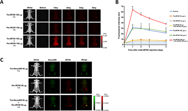 Figure 3: In vivo biodistribution of trastuzumab-IR700 and pertuzumab-IR700. (A, B) NCI-N87 tumor xenografts were visualized with IR700 fluorescence after intravenous injection of Tra-IR700 and/or Per-IR700. Stronger IR700 signals were observed 1 day after the injection of 100 μg each of Tra-IR700 and Per-IR700 than injection of either agent alone. Data are presented as means ± SEM (n = 3, **P < 0.01: 100 μg of Tra-IR700 and 100 μg of Per-IR700 i.v. vs. 100 μg of Tra-IR700 i.v., *P < 0.05: 100 μg of Tra-IR700 and 100 μg of Per-IR700 i.v. vs. 100 μg of Per-IR700 i.v., Student’s t-test). (C) NCI-N87 tumors (right dorsum) were specifically visualized with Tra-Alexa488 and Per-IR700 fluorescence, while NIH/3T3 tumors (left dorsum) did not show detectable fluorescence signals (n = 3).