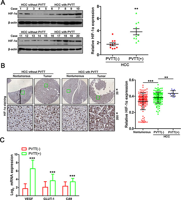 Figure 1: Increased intratumoral hypoxia is associated with PVTT formation in HCC patients. (A) HIF-1α expression in 10 PVTT(−) HCC tumor samples and 10 PVTT(+) HCC tumor samples were evaluated by western blot. **P < 0.01. (B) Relative HIF-1α expression in normal liver tissues, PVTT(−) HCC tissues and PVTT(+) HCC tissues among 143 HCC samples. Representative IHC images are shown in (left panel). **P < 0.01. (C) The mRNA expression levels of target genes (VEGF, GLUT-1, and CA9) were detected using quantitative real time PCR in 20 PVTT(−) HCC tumor samples and 20 PVTT(+)HCC tumor samples. **P < 0.01.
