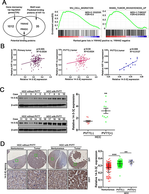 Figure 2: 14-3-3ζ expression is strongly correlated with HIF-1α expression and the formation of PVTT in HCC. (A) Bioinformatic analysis of HIF-1α related genes (left panel, venn diagram) and 14-3-3ζ related pathways involved in invasion and metastasis. (B) Correlation between HIF-1α expression and 14-3-3ζ expression was examined in total 144 tumor tissues (R2 = 0.0534, P = 0.005), PVTT(−) tumor tissue (R2 = 0.0324, P = 0.04) and PVTT(+) tumor tissue (R2 = 0.5127, P = 0.006). (C) 14-3-3ζ expression in 10 PVTT(−) HCC tumor samples and 10 PVTT(+) HCC tumor samples were evaluated by western blot. **P < 0.01. (D) Relative 14-3-3ζ expression in normal liver tissues, PVTT(−) HCC tissues and PVTT(+) HCC tissues among 143 HCC samples. Representative IHC images are shown in (Left panel). **P < 0.01.