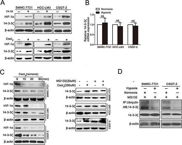 Figure 3: Hypoxia induces elevated expression of 14-3-3ζ in HCC cells. (A) The expression of HIF-1α and 14-3-3ζ in tumor cell lines (SMMC-7721, HCC-LM3, CSQT-2) under normoxic/hypoxic conditions detected by western blot. (B) The mRNA levels of 14-3-3ζ in SMMC-7721, HCC-LM3 and CSQT-2 cells were determined by qRT-PCR. Data are mean ± SEM. and are representative of three independent experiments. NS: no significant, P > 0.05. (C) 14-3-3ζ protein in SMMC-7721, HCC-LM3 and CSQT-2 cells under different conditions (left panel, treated with CoCl2 18 hours and then incubation with normal fresh medium for the indicated times; right panel, incubated with CoCl2 or MG132). (D) The indicated cell lysates were prepared and immunoprecipitated using an agarose-conjugated anti-14-3-3ζ antibody. The immunoprecipitates and cell lysates were analyzed using anti-ubiquitin antibody by western blotting.