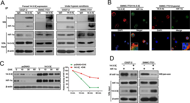 Since both 14-3-3ζ and HIF-1α are induced by hypoxia and were predicted to bind to each other by Scansite software, we investigated whether 14-3-3ζ regulates HIF-1α through protein-protein interactions. Tumor cells (CSQT-2, SMMC-7721) were transfected with plasmid expressing 14-3-3ζ and then lysed to perform a pull down assay using 14-3-3ζ antibody. Western blot detection of HIF-1α in the precipitates confirmed the interaction between 14-3-3ζ and HIF-1α (Figure 4A, left panel). The same experiments were also performed under hypoxic conditions and similar results were also observed (Figure 4A, right panel). For further verification, immunofluorescence was performed with SMMC-7721 cells expressing exogenous 14-3-3ζ or treated with CoCl2. Both 14-3-3ζ and HIF-1α proteins were co-localized in cytoplasm (Figure 4B), indicating the possibility for interactions between 14-3-3ζ and HIF-1α.