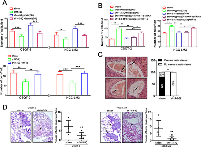 Figure 5: 14-3-3ζ regulates the aggressive behavior of tumor cells by the HIF-1α/EMT signal pathway under hypoxic and normoxic conditions. (A) The invasion ability of indicated cells with different treatments (upper panel, CSQT-2 shcon/sh14-3-3ζ cells and HCC-LM3 shcon/sh14-3-3ζ cells under normoxic/hypoxic conditions; lower panel, cells with or without ectopic HIF-1α expression under nomoxic conditions). Data are mean±SEM. and are representative of three independent experiments. **P < 0.01 and ***P < 0.001. (B) Under hypoxic conditions, invasion assays were performed for the indicated cells following treatment with or without modulated HIF-1α expression. Cell invasion was determined with crystal violet staining. Data are mean ± SEM and are representative of three independent experiments. *P < 0.05 and **P < 0.01. (C) PVTTs (indicated by arrows) were detected by liver HE staining in an orthotopic transplantation of nude mice which implanted with CSQT-2 cells (left panel). Incidences of PVTT was examined under the microscope (right panel). **P < 0.01. (D) Representative images of lung tissue sections from each group (hematoxylin and eosin stain (indicated by arrows, left panel); bars, 100 μm). The number of lung metastatic foci in each group (n = 5) of CSQT-2/shcon and CSQT-2/sh14-3-3ζ and HCC-LM3/shcon and HCC-LM3/sh14-3-3ζ xenografted mice was calculated microscopically 8 weeks after tail vein injection (right panel). **P < 0.01.