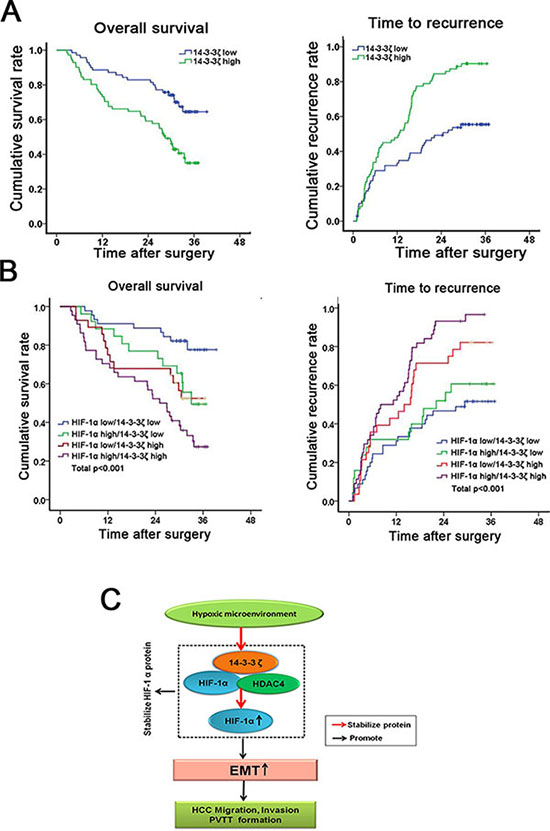 Figure 6: Combination of 14-3-3ζ and HIF-1α has a better prognostic value for HCC. (A) The cumulative survival (left pane) and recurrence (right panel) rate were analyzed in 143 HCC patients. (B) The combination of 14-3-3ζ and HIF-1α increased the probability of a poor prognosis. (C) Schematic representation of the mechanism underlying hypoxia/14-3-3ζ/HIF-1α-facilitated HCC metastasis and PVTT formation.
