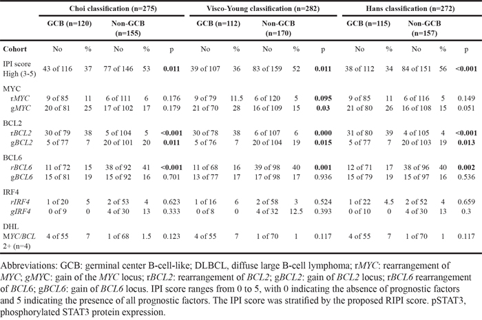 In an attempt to confirm that IHC algorithms can be used to prognostically stratify DLBCL patients, we compared the Hans, Choi and Visco-Young algorithms in a cohort of 297 diagnostic samples from patients with R-CHOP-treated DLBCL. Also, to establish whether deregulation of specific oncogenes may further classify COO-based DLBCL subtypes, adding meaningful prognostic information, we performed FISH of BCL6, BCL2, IRF4 and MYC and evaluated the expression of MYC, BCL2, BCL6 and pSTAT3 proteins in the same samples.