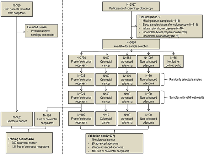 Figure 1 provides the flow diagram showing the study population selection for the training set and the validation set. Overall, 380 clinically identified CRC cases were included in our study. After excluding 28 samples with invalid multiplex serology test results, the remaining 352 CRC patients were included as cases in the training set. The independent validation set samples were exclusively sampled from participants enrolled in the BliTz study in 2005-2013. After excluding participants without adequate blood samples, participants who do not represent a true screening setting, and participants with potentially false negative results at screening colonoscopy, 5680 participants were eligible for the sample selection, from whom 417 samples (all CRC case and random sample of advanced adenomas, non-advanced adenomas and controls free of colorectal neoplasms) were selected for our measurement. After further excluding samples with invalid laboratory results, 49 CRC cases, 99 advanced adenomas, 29 non-advanced adenomas and 224 controls free of colorectal neoplasms were included in the analysis. The average time between blood sample withdrawal and screening colonoscopy among these participants was 6.6 days. We randomly selected 124 controls from this screening setting as control group in the training set. The remaining 100 participants were used as controls in the validation set.
