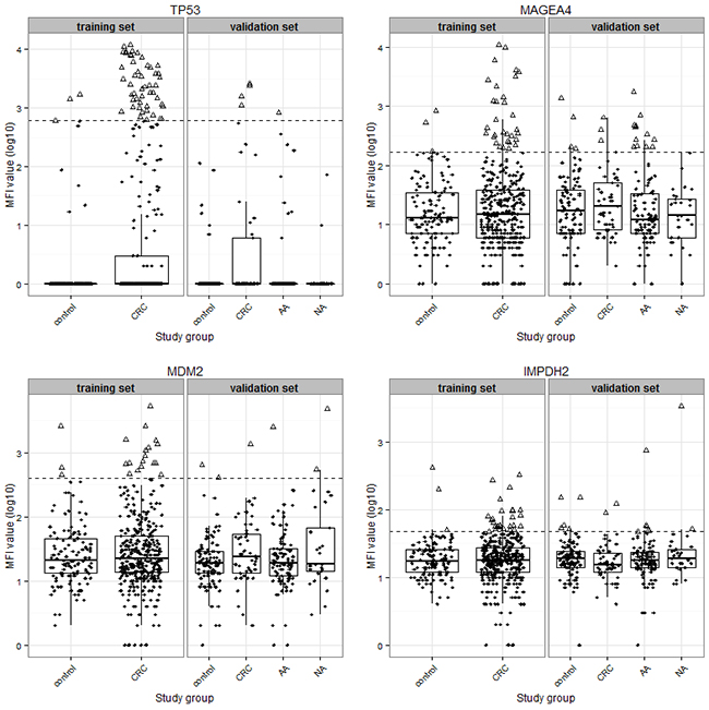 The apparent discrepancies could be explained by different design issues and different study settings adopted in different studies. Most previous studies recruited participants in clinical settings, i.e., using clinically detected cases and convenience controls or healthy donors who often substantially differed from cases with respect to major characteristics that may be related to the autoantibody levels, such as age and sex [18-21]. Under such circumstances, a number of factors, such as tumor stage [22] and size, or differences in sociodemographic characteristic between cases and controls [23] may affect the validity of study findings. Moreover, most previous studies did not take efforts to adjust for the potential overestimation of diagnostic performance indicators, either through internal validation (bootstrap or cross-validation) or through external validation. In our analyses, a two-step approach was taken including selecting biomarkers in a training set and subsequently validating findings in an independent validation set. Of note, the validation was performed in a true screening setting, i.e., in the ideal target population for CRC screening, with colonoscopic verification of presence or absence of colorectal neoplasms (including adenomas) among all participants. By adopting such a study design and analysis strategy, the pitfalls often encountered in retrospective study designs could be avoided [24, 25]. In addition, we applied multiplex Luminex-based serological assays to measure all 64 autoantibody markers. Previous research results indicated that multiplex serology exhibited increased detection of weak antibody responses compared to ELISA [26], thus possibly providing more accurate results regarding serum autoantibody responses against TAAs.
