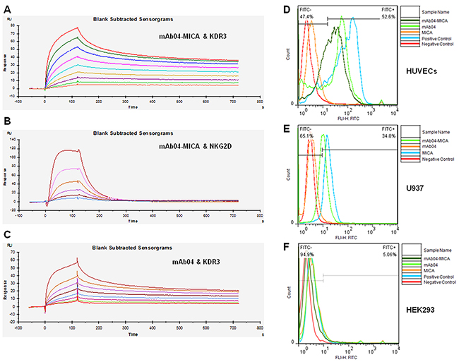 Figure 2: mAb04-MICA bound specifically to KDR3 and NKG2D. A. Set of sensorgrams of KDR3 binding with mAb04-MICA. The association rate increased with increasing concentration of the KDR3 (from bottom to top), ranging from 0.78125 nM to 200 nM. The complex dissociated when buffer flowed through at 120 s. KD (M): 1.29×10−9. B. Set of sensorgrams of NKG2D binding with mAb04-MICA. The concentration of NKG2D (from bottom to top), ranged from 7.8125 nM to 250 nM. KD (M): 7.102×10−7. C. Set of sensorgrams of KDR3 binding with mAb04. The concentration of KDR3 (from bottom to top), ranged from 0.625 nM to 160 nM. KD (M): 1.05×10−9. D. mAb04-MICA and mAb04 showed high affinity with VEGFR2 over-expressing HUVECs, the binding rate was 52.6% and 51% respectively. E. mAb04-MICA could bind to NKG2D over-expressing U937 cells (34.8%). The binding rate was relatively lower than hMICA (63.4%). F. The VEGFR2/NKG2D-negative cell line HEK293 was employed as a negative control, data of this group demonstrated the specificity of binding.