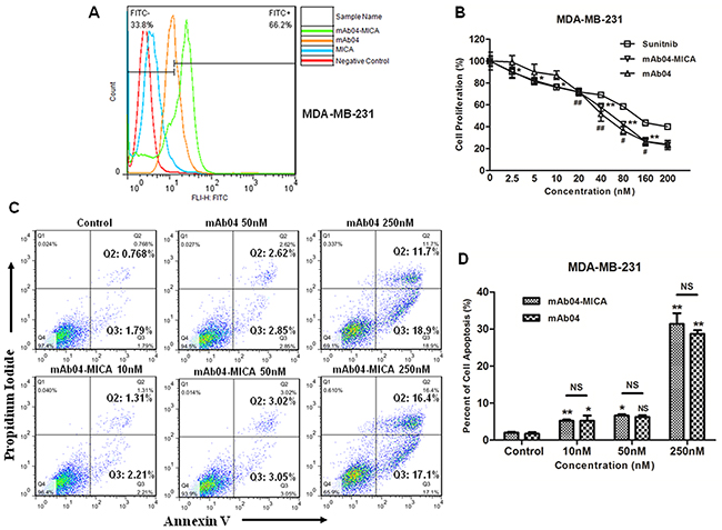 Figure 4: mAb04-MICA inhibited proliferation and induced apoptosis of MDA-MB-231 cells. A. mAb04-MICA/mAb04 exhibited high binding rate with MDA-MB-231 cells, reaching 66.2% and 50.3% respectively. B. mAb04-MICA (Data were presented as the mean ± SD, n = 5, *p < 0.05, **p < 0.01)/mAb04 (n = 5, #p < 0.05, ##p < 0.01) inhibited the proliferation of MDA-MB-231 cells with the IC50 (53.196 ± 1.726 nM), similar to that of mAb04 (57.272 ± 1.758) and Sunitnib (73.392 ± 0.952). C. MDA-MB-231 cells were incubated with various treatments at 37°C for 48 h and analyzed by flow cytometry following staining with Annexin V-FITC and PI. The percentage of cells in each quadrant was indicated. D. Quantitative analysis of apoptosis assay (Data were presented as the mean ± SD, n = 3, *p < 0.05, **p < 0.01).