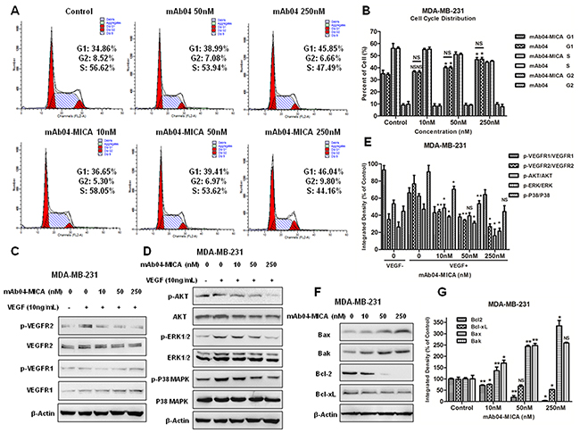 Figure 5: mAb04-MICA induced the G0/1 phase arrest in MDA-MB-231 cells, inhibited VEGFR2 pathway and modulated the Bcl-2 family protein. A. Cell cycle analysis of MDA-MB-231 cells that were incubated with various treatments for 48 h and stained with PI. The percentage of cells in each phase was indicated. B. Quantitative analysis of cell cycle assay. C, D. Western blot analysis for p-VEGFR2/VEGFR2, p-AKT/AKT, p-ERK/ERK and p-P38/P38 of MDA-MB-231 cells treated with mAb04-MICA. Equal loading of protein was confirmed by stripping the immunoblot and reprobing it for β-actin. E. Gray scanning and data statistics of C, D. F. Western blot analysis for Bcl-2 family protein of MDA-MB-231 cells treated with mAb04-MICA. G. Gray scanning and data statistics of (F) Data were presented as the mean ± SD, n = 3 (B, E, G), *p < 0.05, **p < 0.01.