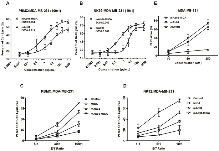 Figure 6: mAb04-MICA enhanced the cytotoxic effect of PBMC/NK92 cells compared to mAb04, and maintained the CDC effect. A, B. Cytotoxicity assay to assess the PBMC/NK92 cell-mediated killing of MDA-MB-231 cells. The EC50 of mAb04-MICA/mAb04 were fitted. C, D. MDA-MB-231 cells were used as target cells and PBMC/NK92 cells as effect cells for a LDH release assay. The increase of cell lysis was enhanced significantly upon treatment with mAb04-MICA compared to mAb04. Measurements were performed in triplicates (A-D). E. MDA-MB-231 cells were incubated in triplicate with mAb04-MICA/mAb04/AK404R and rabbit serum. Following washing, cells were stained with PI and analyzed by flow cytometry to assess viability. Data were expressed as the mean ± SD of PI-positive percentage.