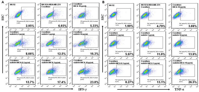 Figure 8: NK92 cells secreted more cytokines when treated with mAb04-MICA in the coculture with MDA-MB-231 cells. A, B. Flow cytometry data represented the distribution of cytokine positive cells among NK92 cells, which indicated the proportion of NK92 cells expressing IFN-γ/TNF-α along the x-axis increased as the treatments concentration increased. The percentage of IFN-γ/TNF-α positive cells was calculated by FlowJo software.